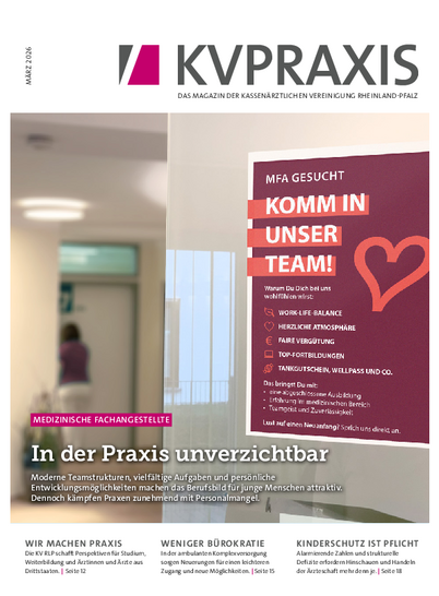Viermal im Jahr erscheint das Magazin der KV RLP für Mitglieder: KV PRAXIS – mit dem Innenteil KV KOMPAKT, der die wichtigsten Mitteilungen für die Praxis enthält.